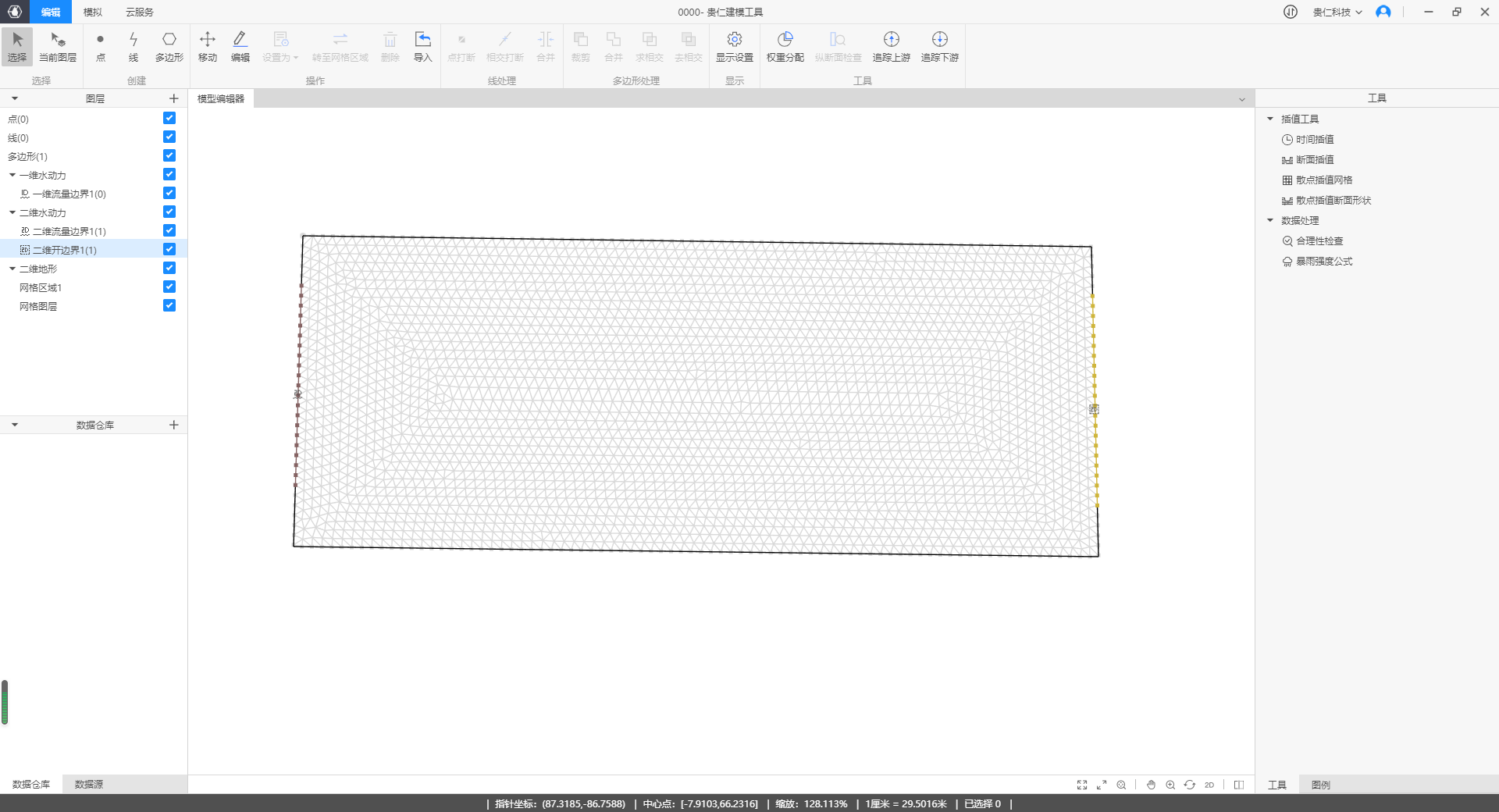 - 二维水动力模型至少有一个带固壁边界的网格地型,以及一个流量或水位边界的模型组成。