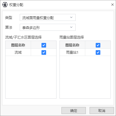 • 用户可通过【面雨量】配置页面,配置各雨量站的权重系数,也可以通过【模型图层】的工具栏【权重分配】工具,使用指定算法自动分配权重